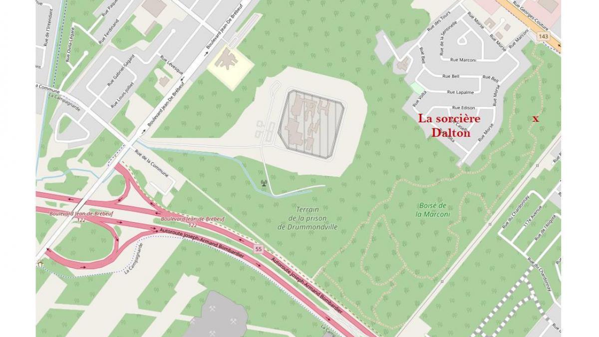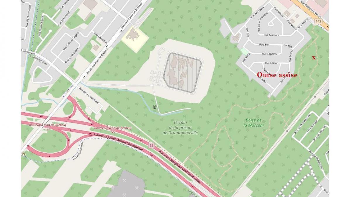 L'ourse assise qui m'a suivie le matin du 6 décembre 2015 depuis le boisé de la Marconi jusqu'à la rue Robitaille sera démystifiée en descendant le boisé depuis l'entrée près de la rue Morse soit en bas du site de l'autel expérimental en suivant les indications des boussoles aux croisements de terrain.